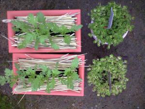 三つのプランターにワラを敷き詰める作業が終わって一言