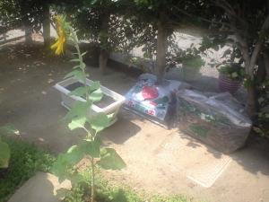 庭のミニヒマワリのかたわら、うららかな日差しに照らされる春菊クンたち、