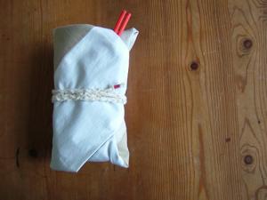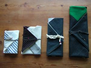 色んな生地を組み合わせられた布に、紐までついて・・・クルクルッと手軽に包めちゃいマス。