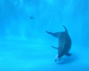 そしてトレーニングの合間、イルカたちがボールを口に加えてプールの周りにいるお客さんたちのところへ・・・