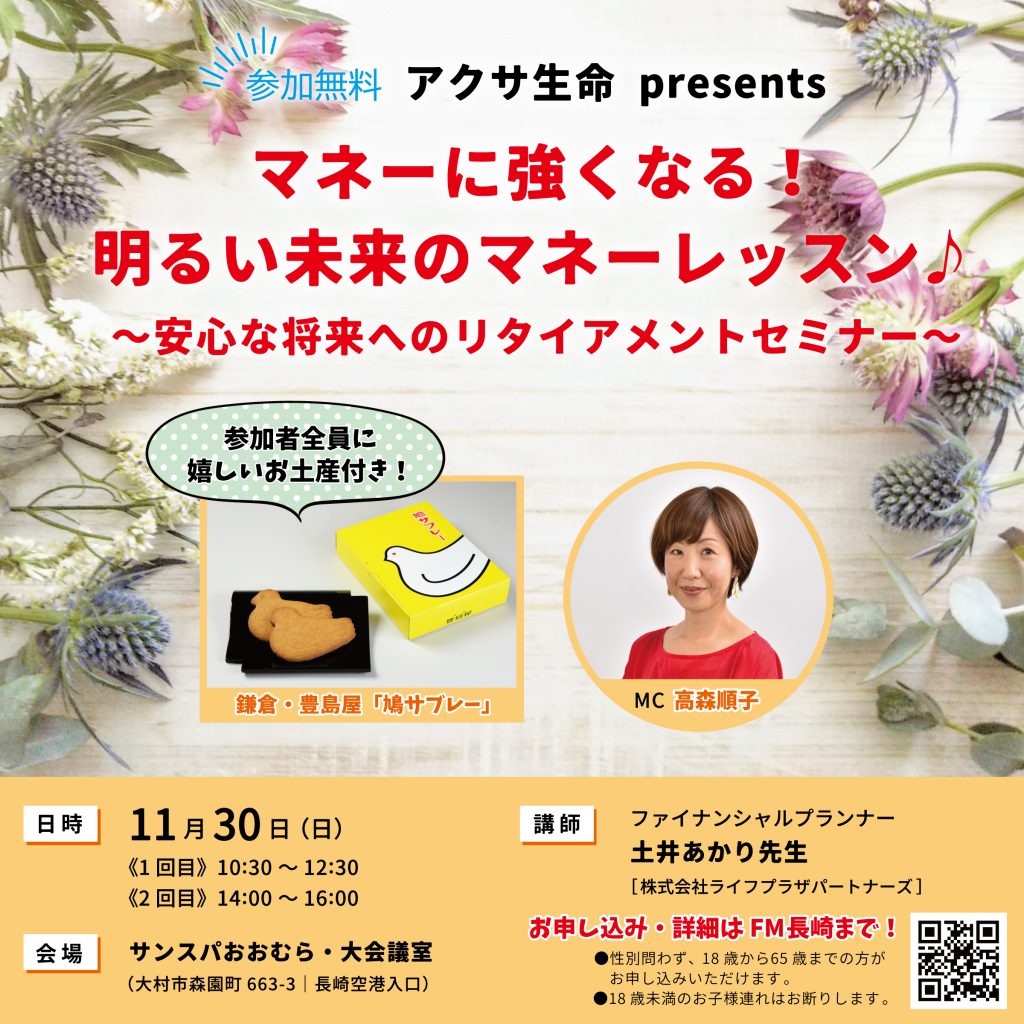 毎回ご好評いただいている『アクサ生命 presents マネーに強くなる!明るい未来のマネーレッスン♪』が11月30日(日)に大村で開催決定!